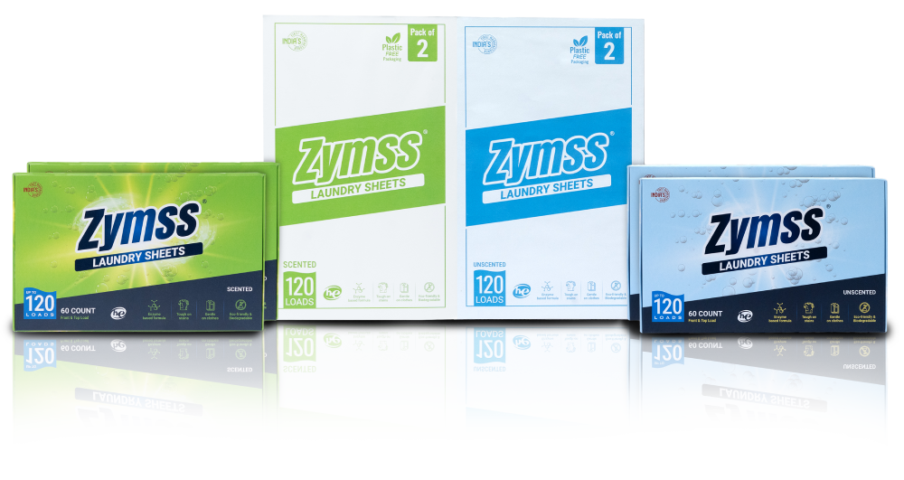 Zymss laundry sheets are the result of thoughtful research and development. The focus is to leverage on enzyme based formula as enzymes are both powerful in breaking down stains and gentle on the environment. Hence its a clever adoption of our brand name Zymss.