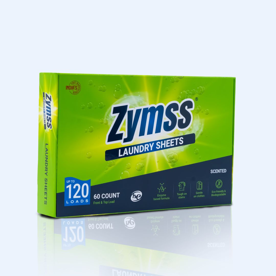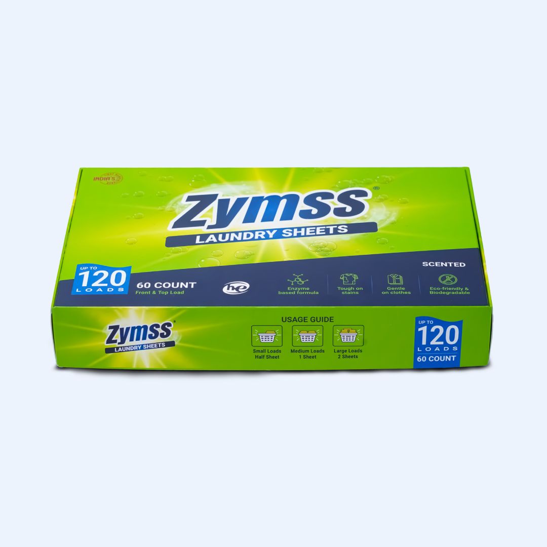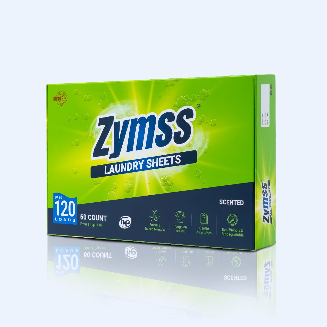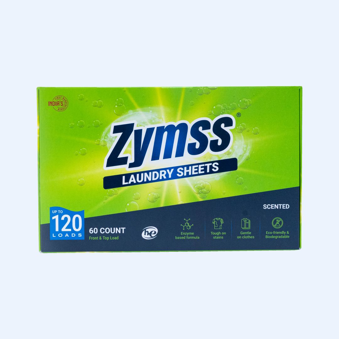 Zymss laundry sheets are the result of thoughtful research and development. The focus is to leverage on enzyme based formula as enzymes are both powerful in breaking down stains and gentle on the environment. Hence its a clever adoption of our brand name Zymss.
